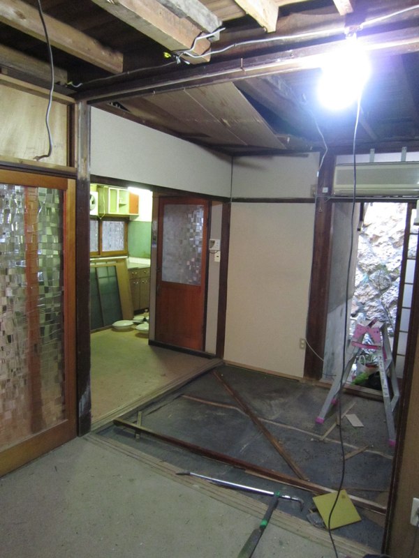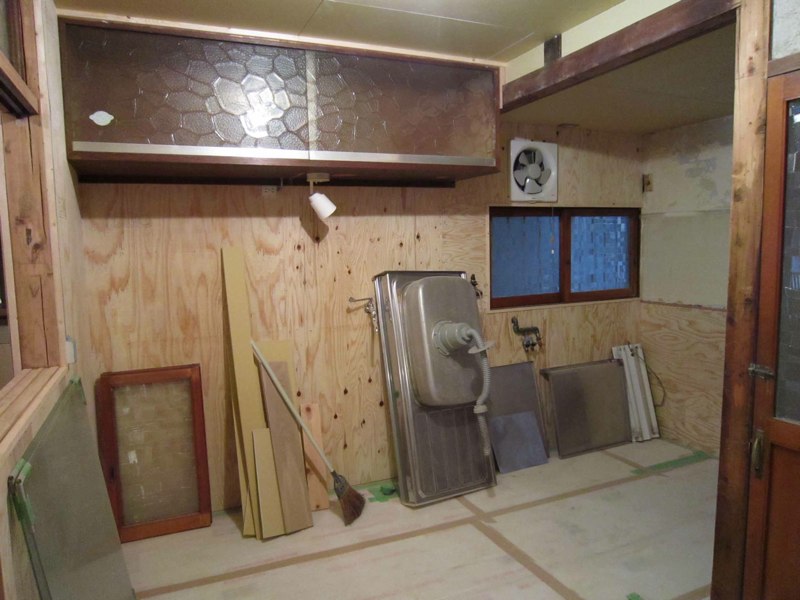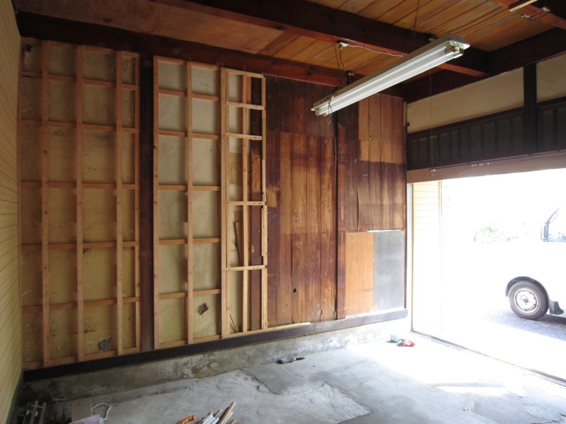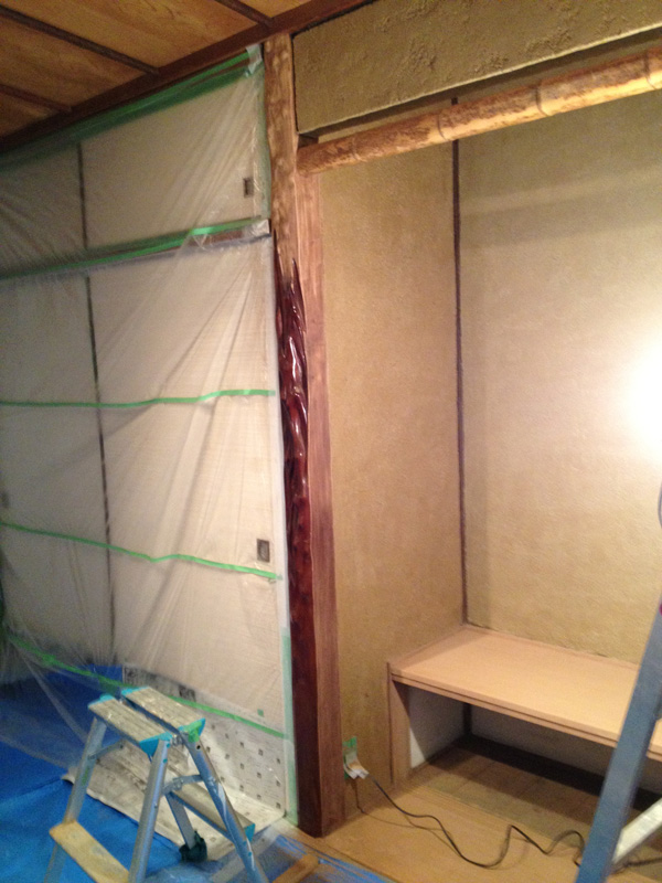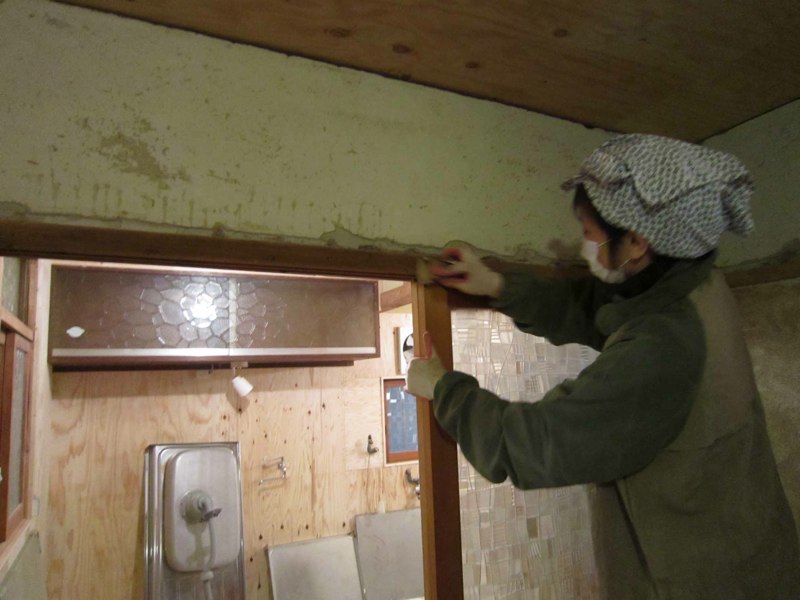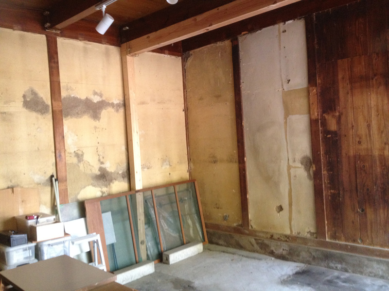 ![プリント合板を剥がすと、土壁や昔の板貼りが顔を出しました]()