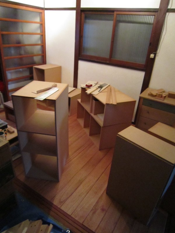 ![引き出しの構成をとりあえず段ボールで仮組みしてみて、]()