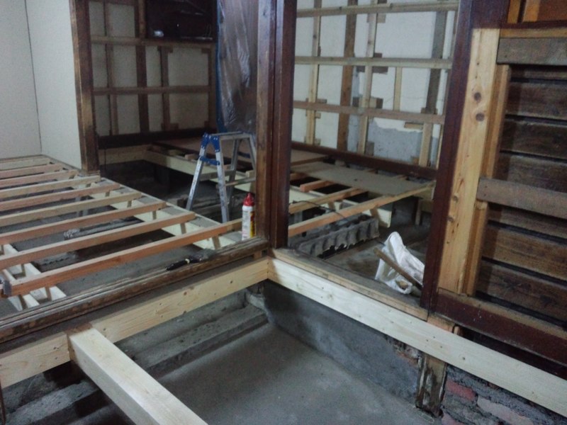一階の床下。傷んだところを補強しながら床の根太組み