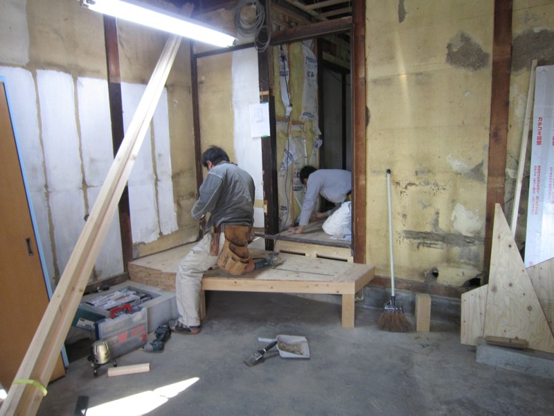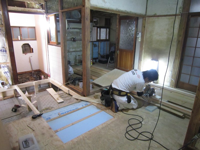 ![一階の床下。傷んだところを補強しながら床の根太組み]()