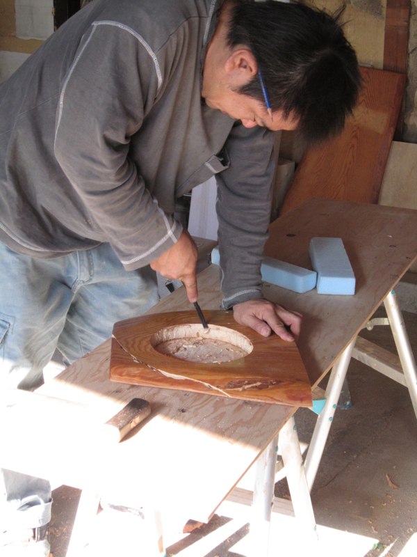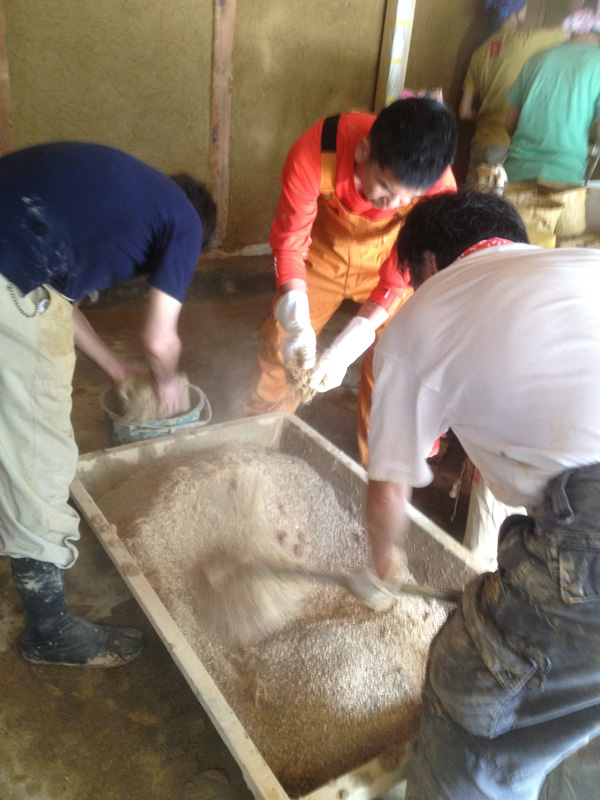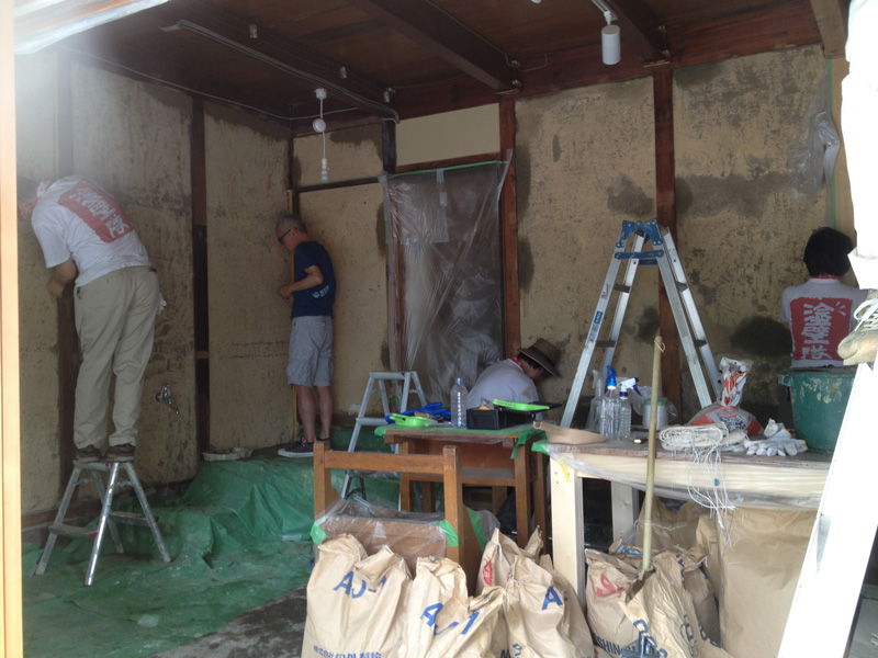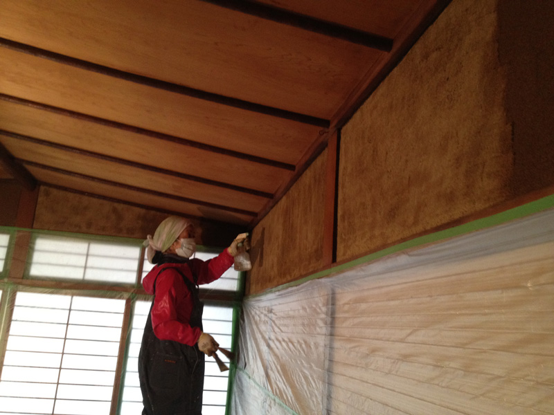 ![漆喰にときどき色粉を混ぜながら塗る。さあ、どうなるか…]()