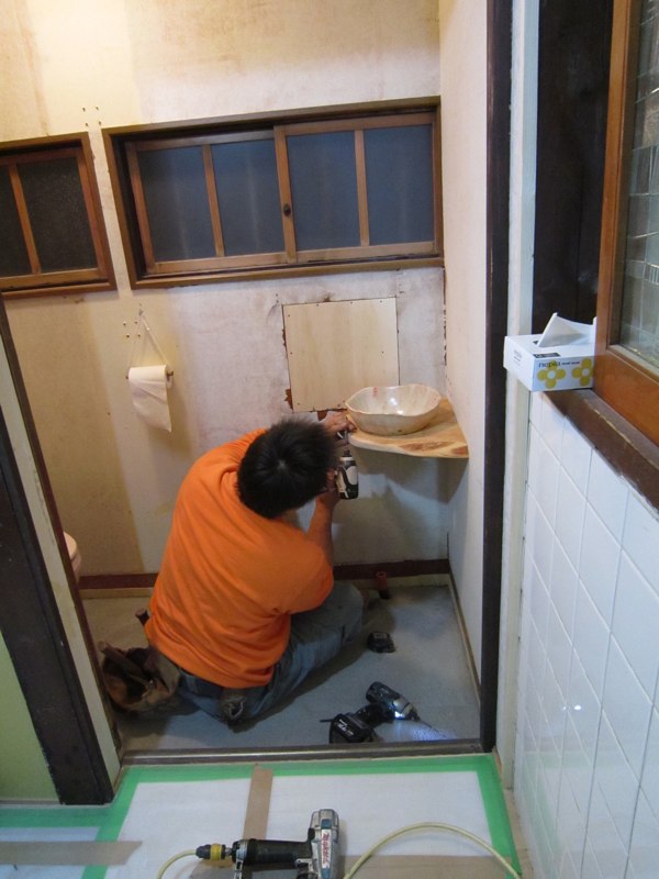 ![今まで使っていた座卓は天板をトイレ手洗い棚の材料にするため。]()