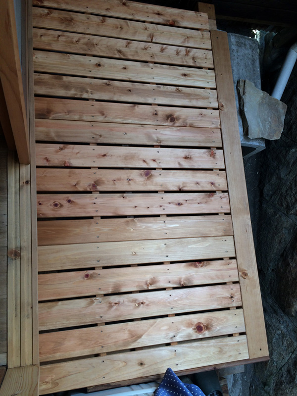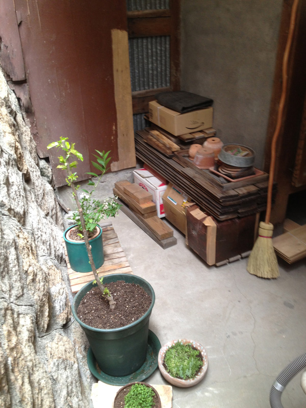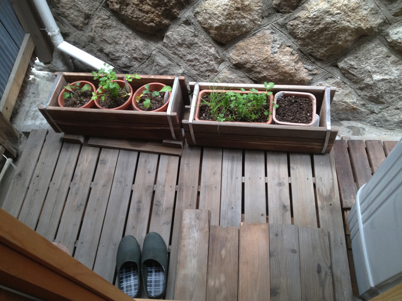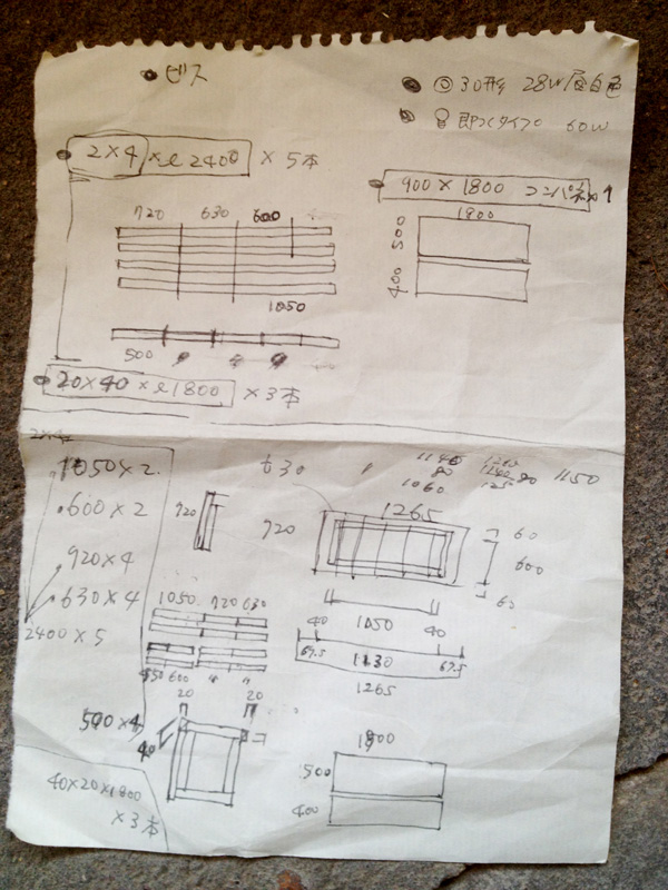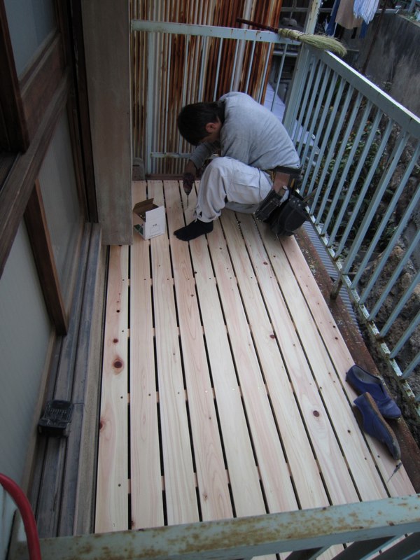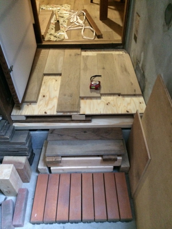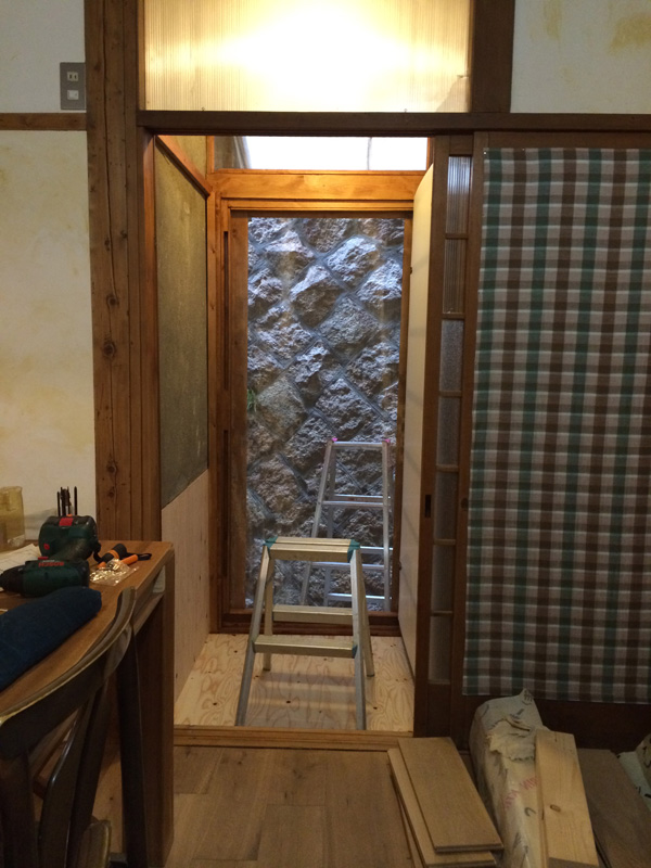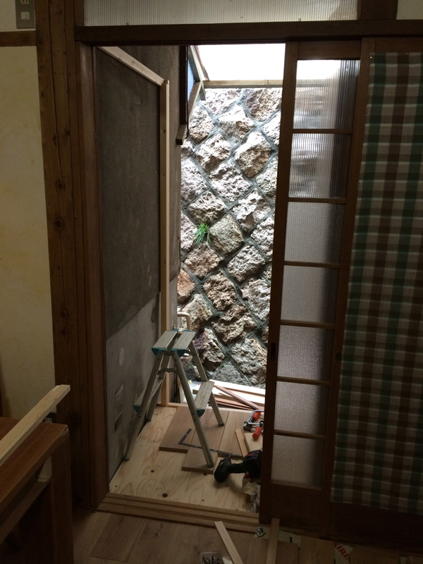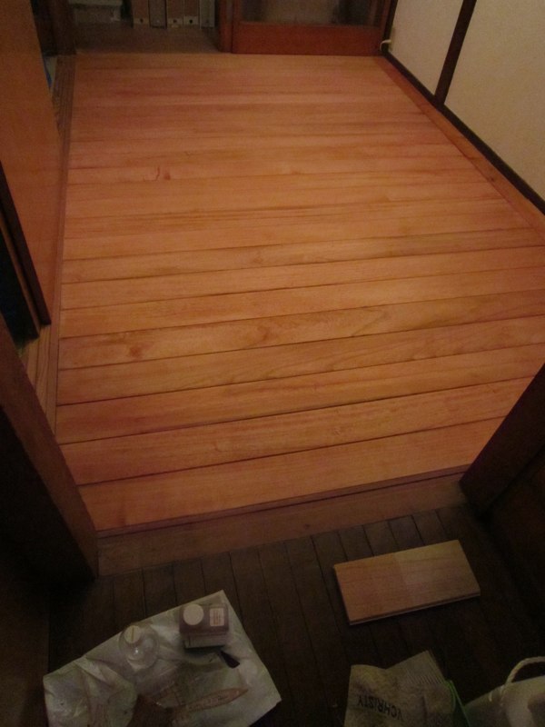 北側では引越す前のベランダで使っていた桧のスノコ再利用で濡縁を製作中。柿渋を塗っていたので年季が入った色です。