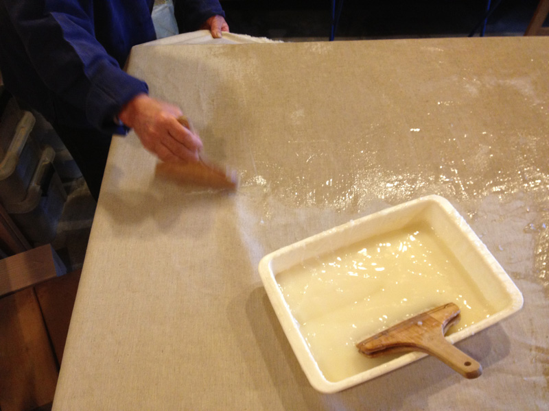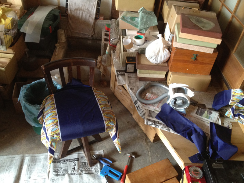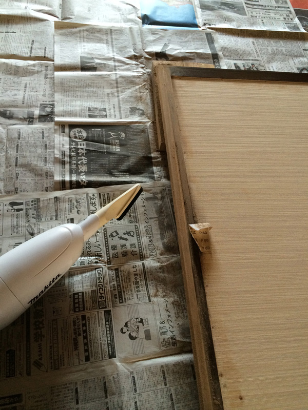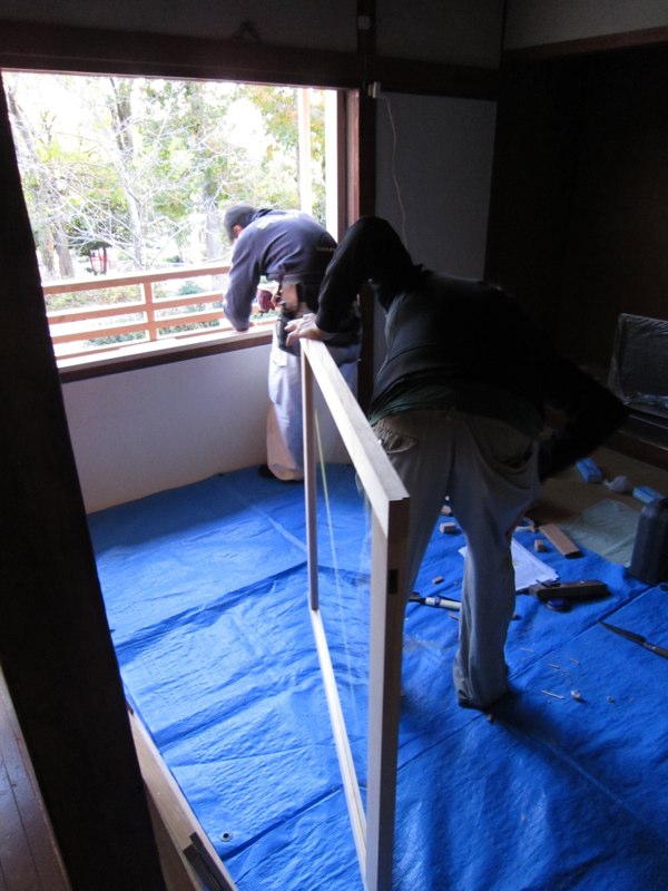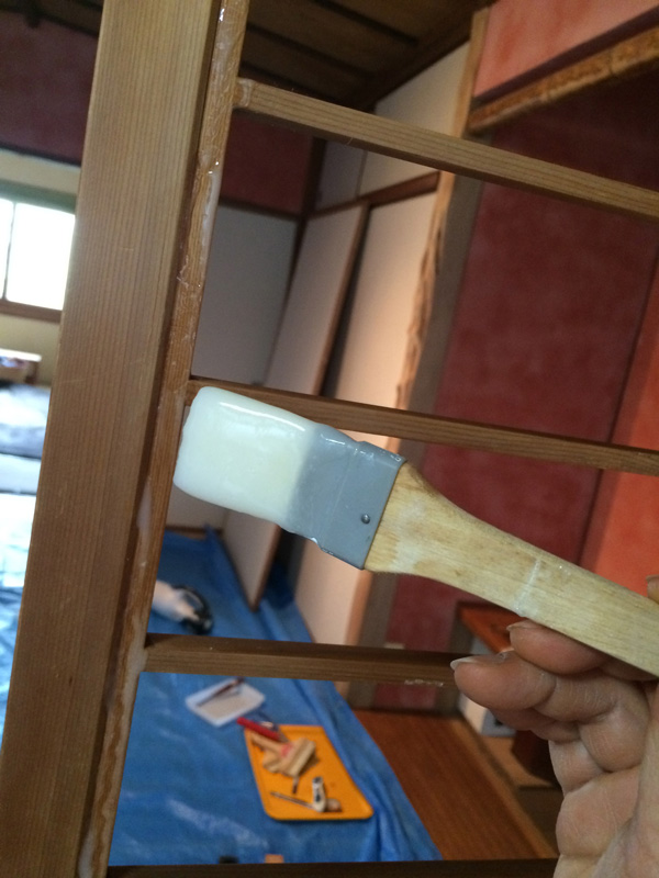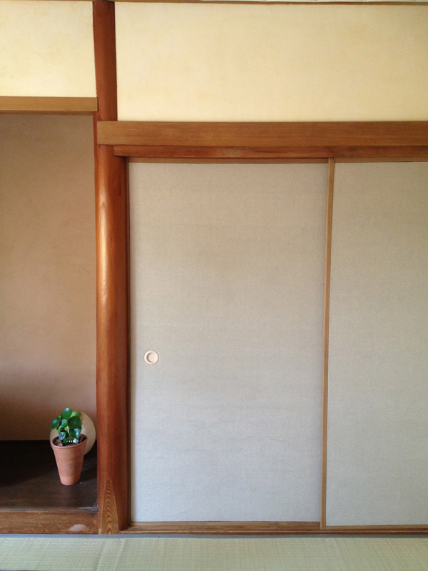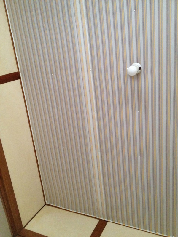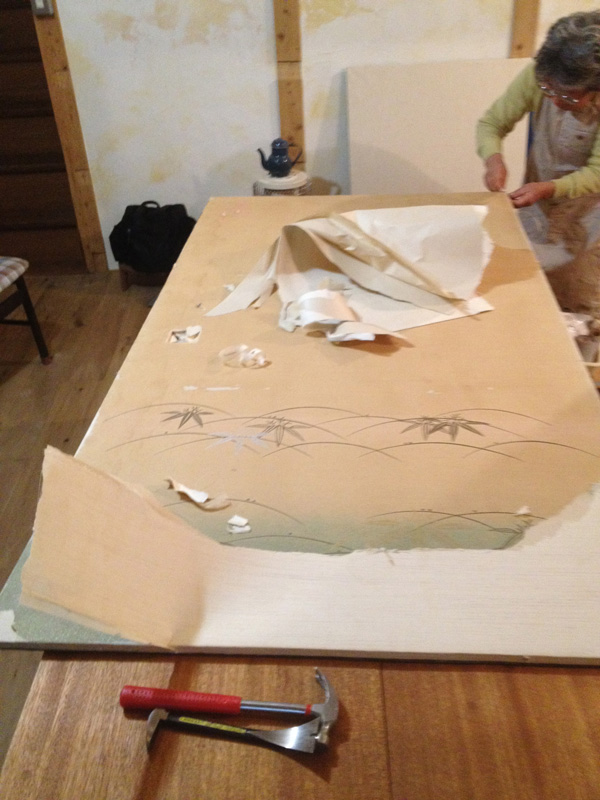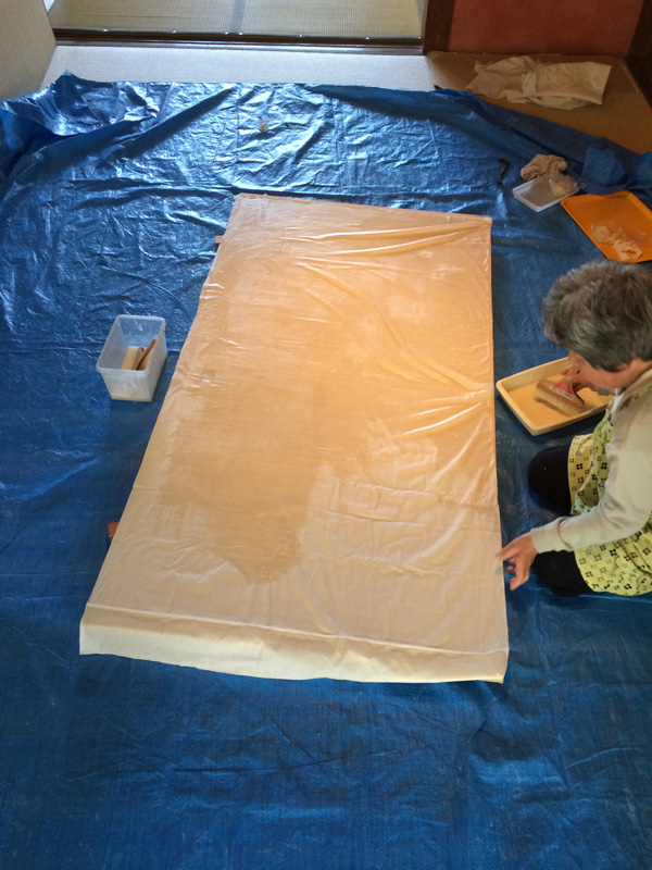 ふすま紙ではなくて今回は綿布をはります。また母に手伝ってもらう。