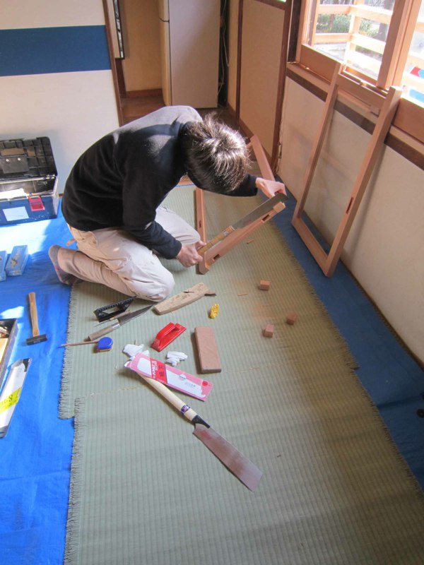 しかも余り木材でつくるので、穴や継ぎ接ぎだらけ。周りの建具と馴染むようにポアステインとオイルで古色に仕上。