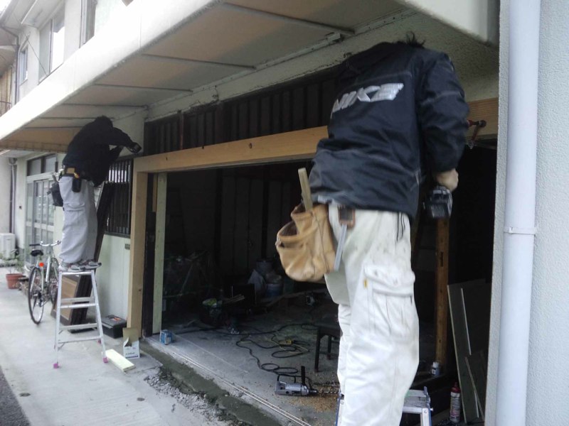 ![一階正面の古いシャッターと古い建具レールを取り外し]()