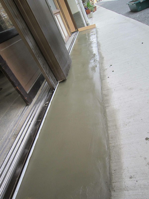![シャッターのレールも埋めて、正面土間のモルタル仕上がり]()