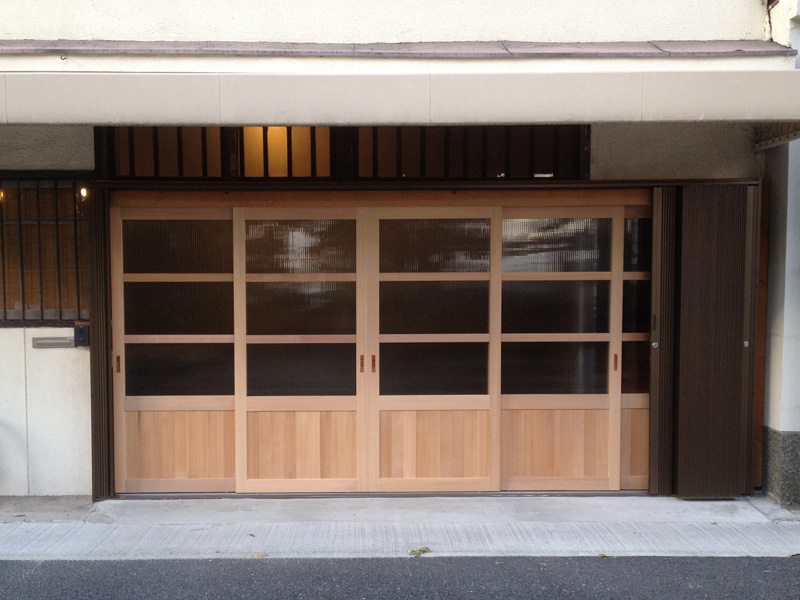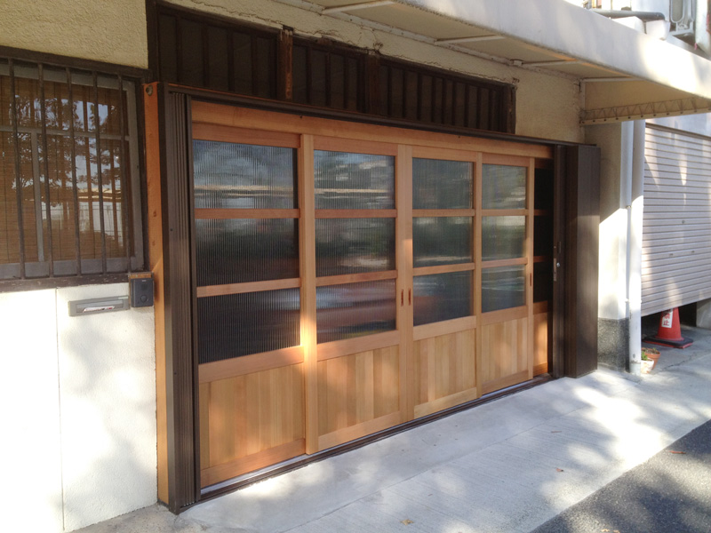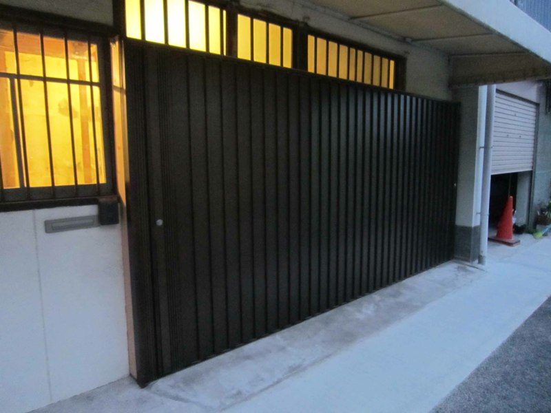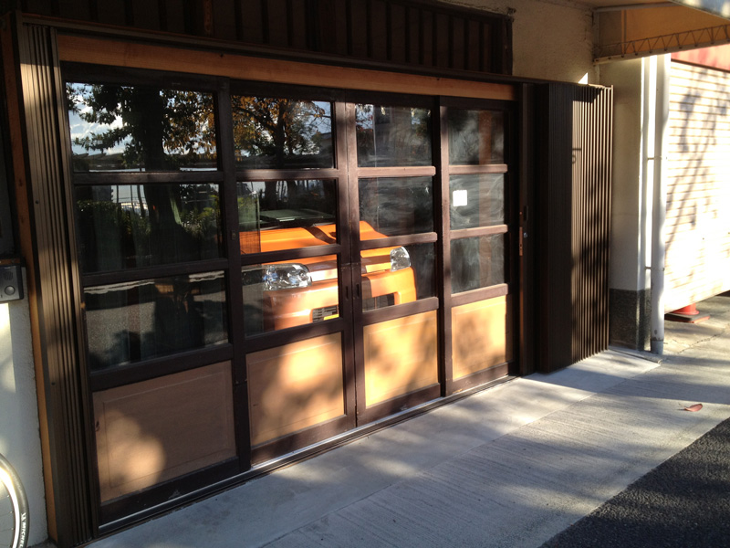 ![横引きシャッターがつきました。これは折り畳まれた状態]()