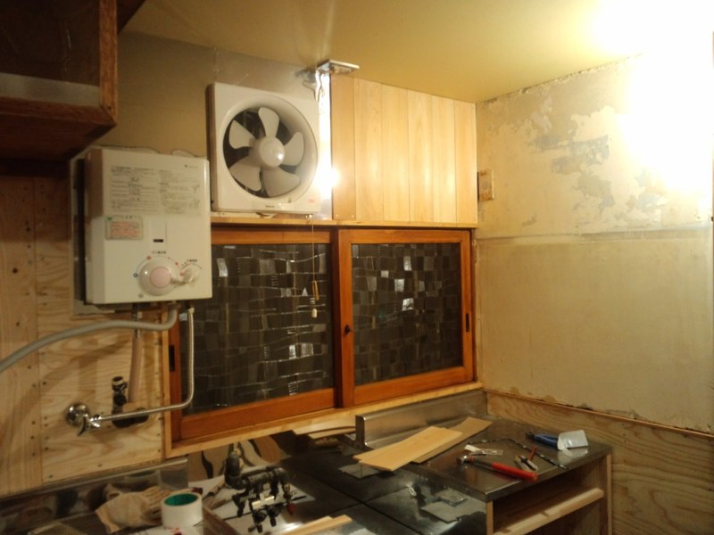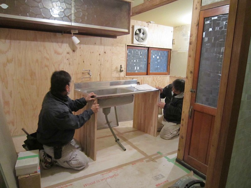 キッチンは、前のステンレス流しや天板をはずしておいたものに、