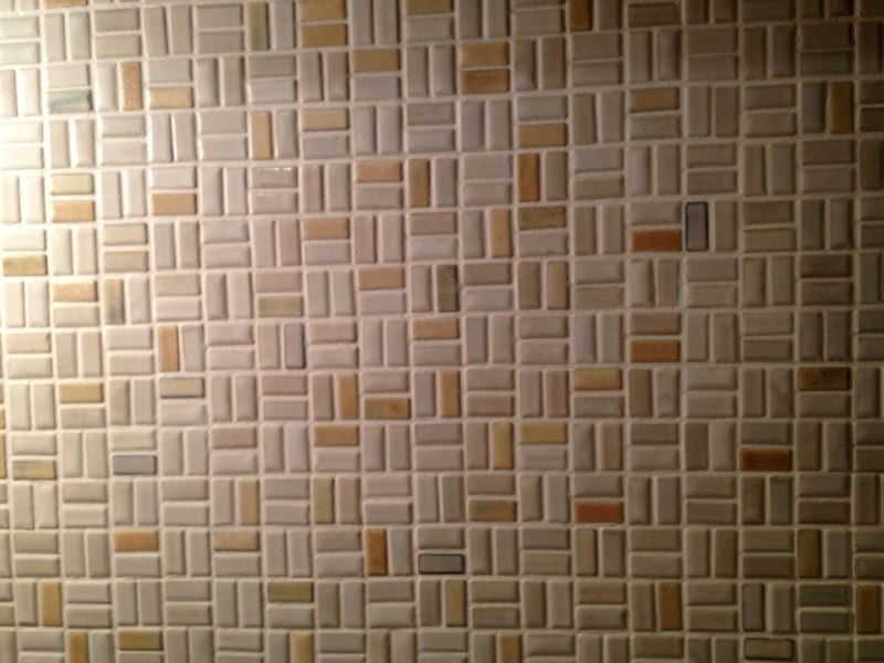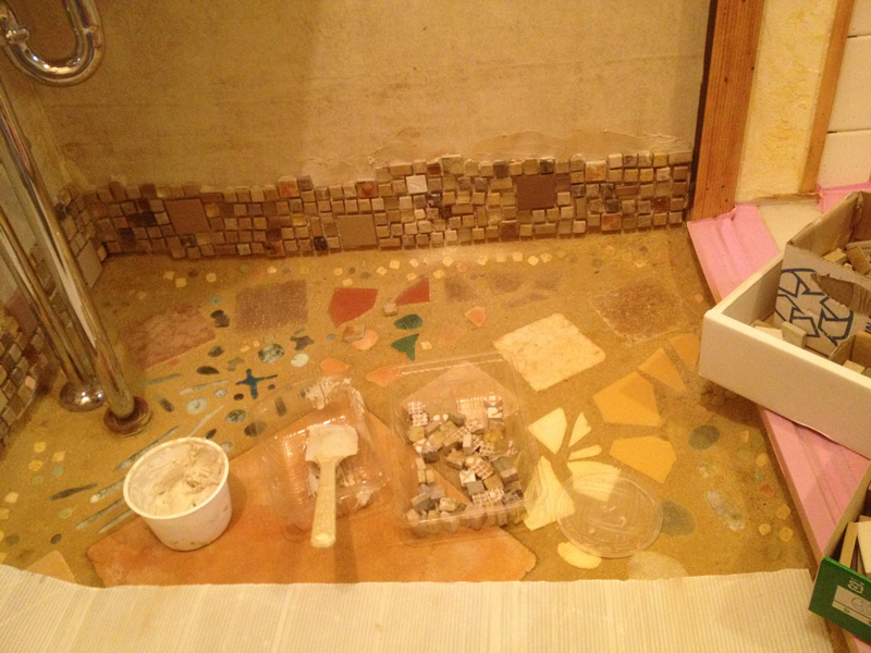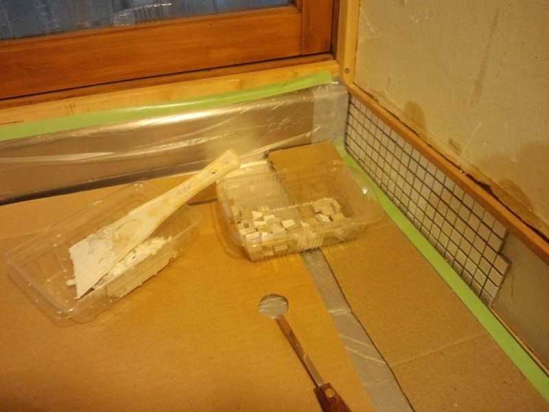 流しの前もタイル貼り 既成のモザイクにアレンジ加えたくて結局、一枚ずつ貼ってます