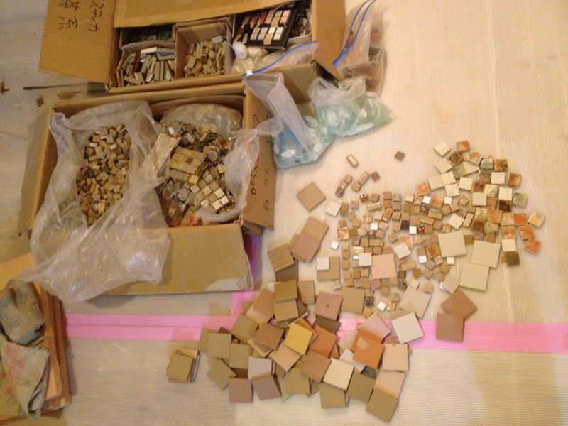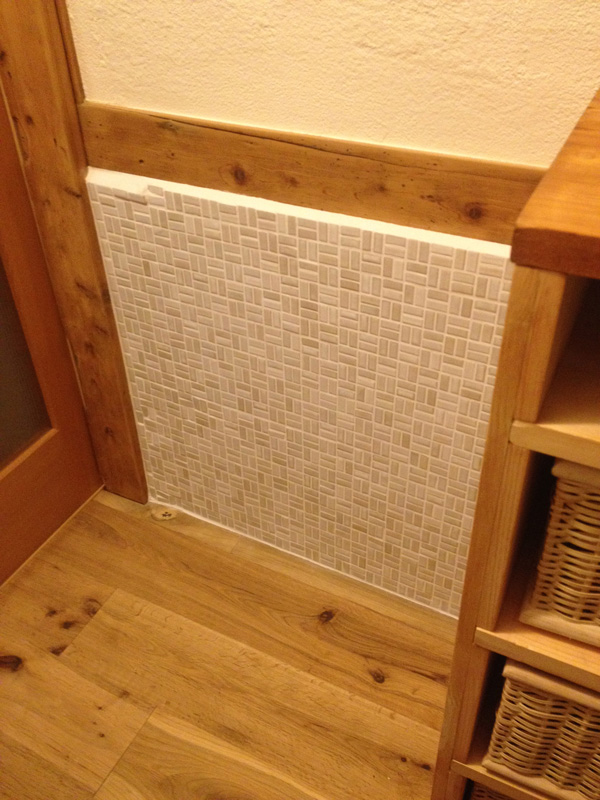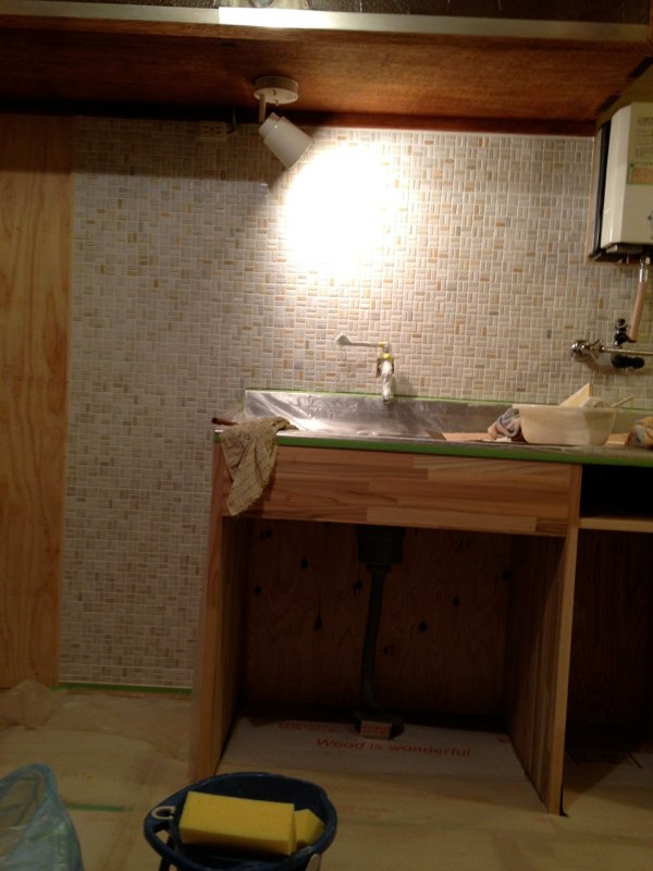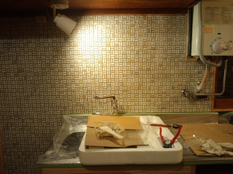 ![流しの前もタイル貼り 既成のモザイクにアレンジ加えたくて結局、一枚ずつ貼ってます]()