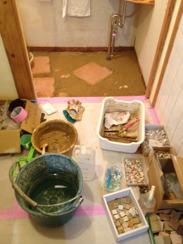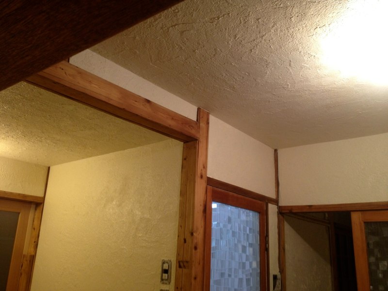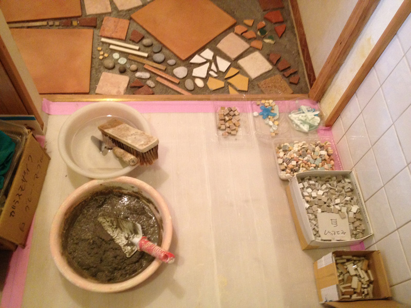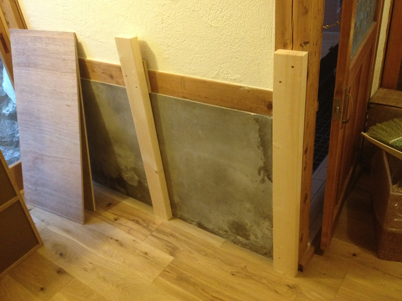 ![2Fで使った珪藻土が少しだけ余ったので土間床に塗ってみたところ。(あとでだんだん剥がれてきてこれは失敗とわかる)]()