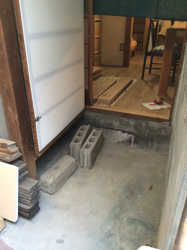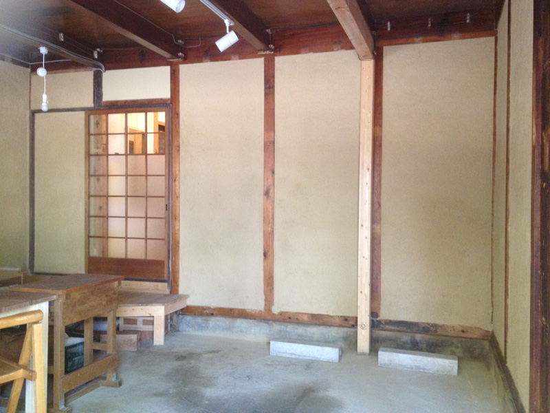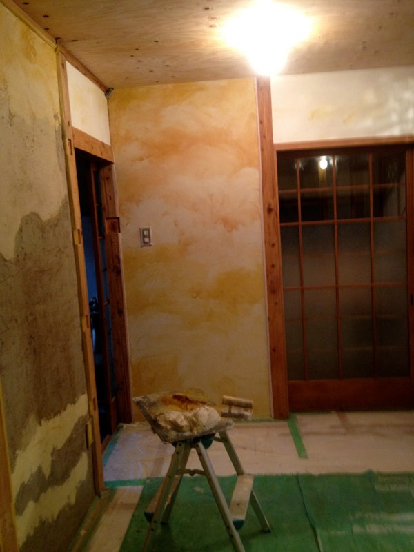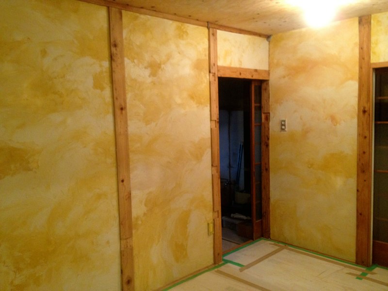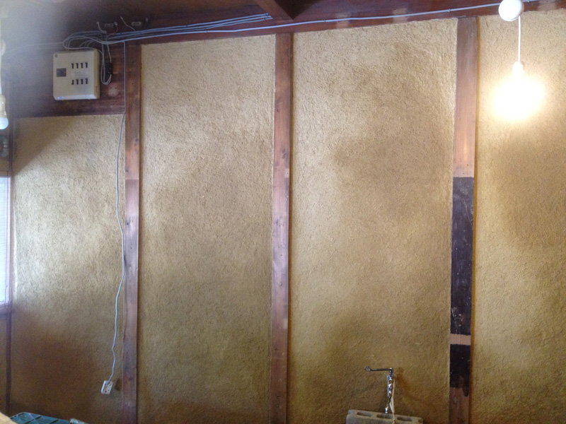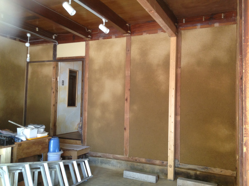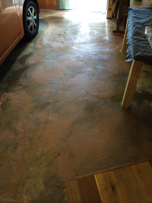 2Fで使った珪藻土が少しだけ余ったので土間床に塗ってみたところ。(あとでだんだん剥がれてきてこれは失敗とわかる)