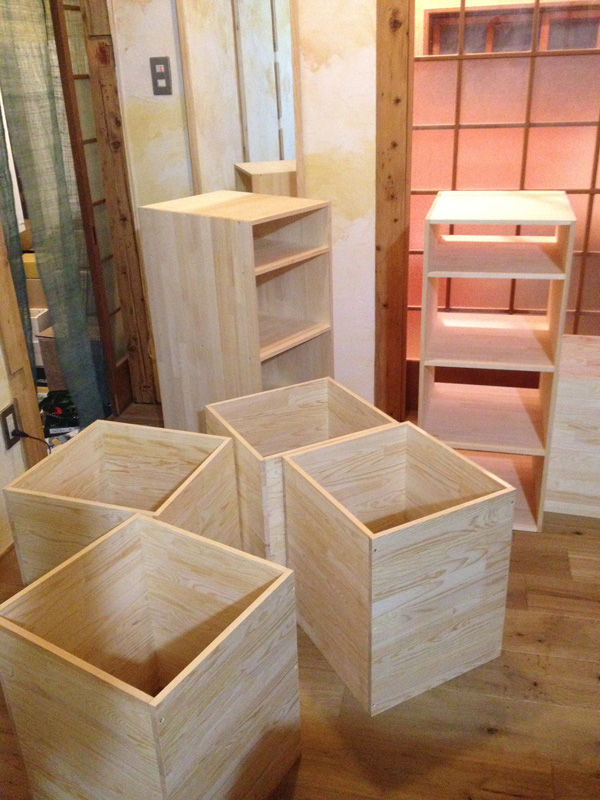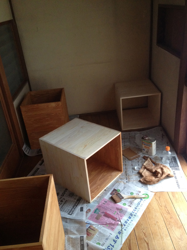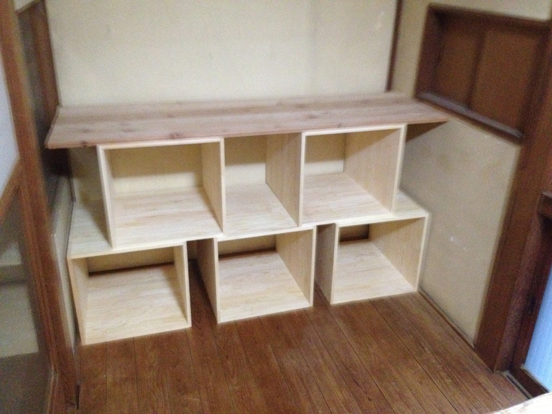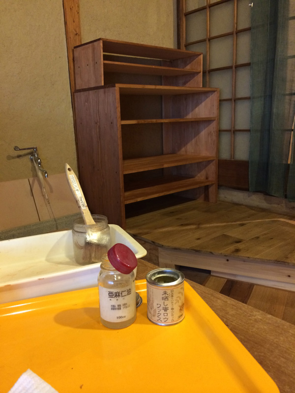 ![オイルを塗って完成。横に置いてるカゴを引出しにするつもり]()