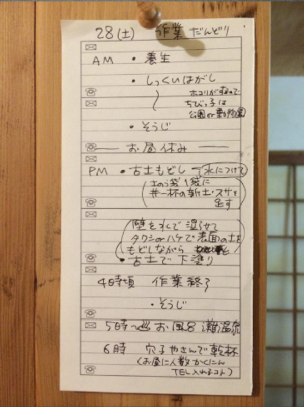 ![ホコリ落とし掃除や、古い柱をヤスリで磨く作業。母に援軍たのむ]()