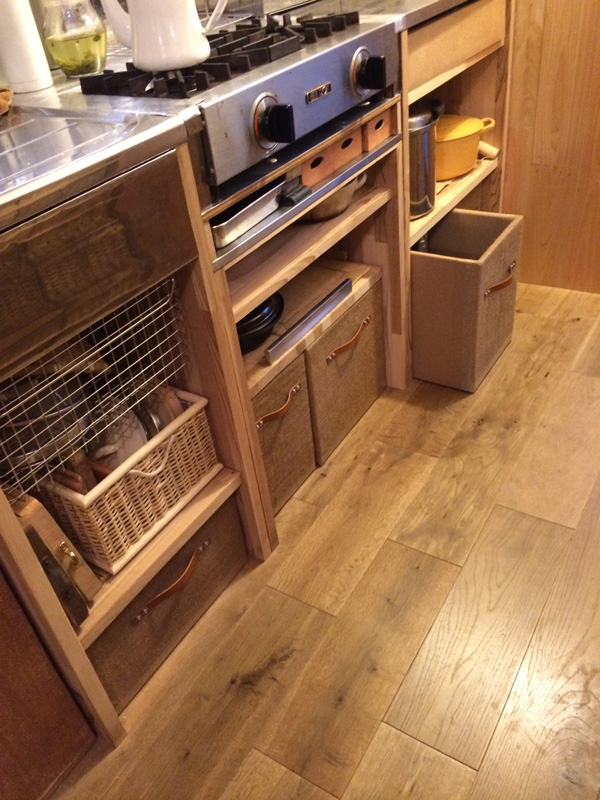 キッチン足元の引き出しはダンボールに紙布貼り、ポアステイン塗り仕上。取手は革ベルト。