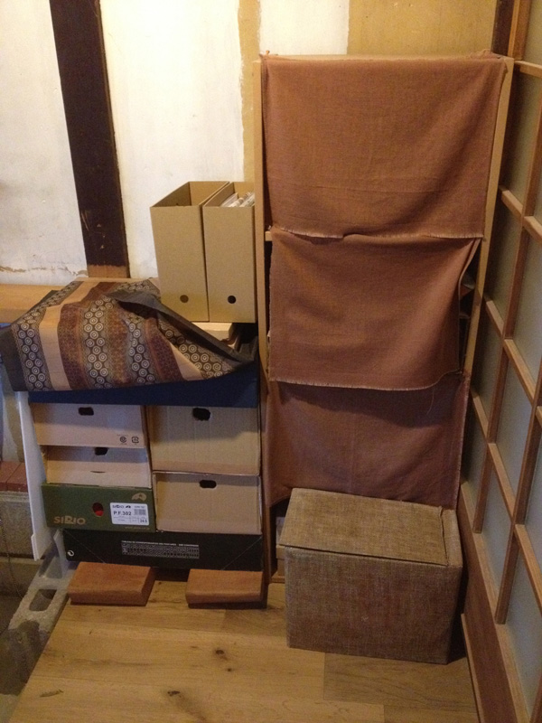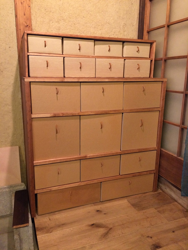 引出しはダンボールです。軽くて季節によって引出しごと入替えできるのが便利なので。