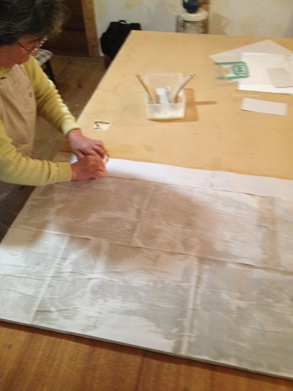 ![ふすま紙ではなくて今回は綿布をはります。また母に手伝ってもらう。]()