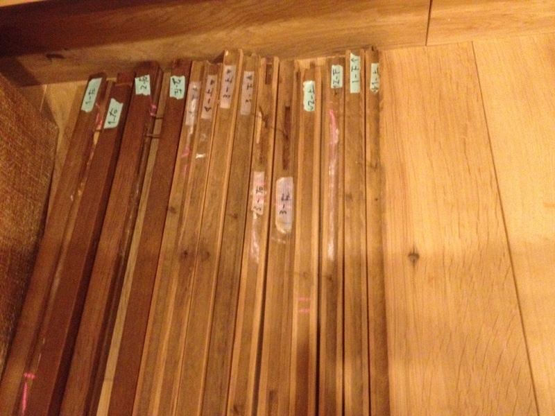 表面は実はフローリングのサンプル余り材を組合せてつくったので、道具棚兼木材サンプルとなってます。引出しを開けたら木材名メモあり。