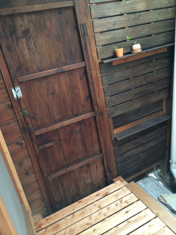 ![北側では引越す前のベランダで使っていた桧のスノコ再利用で濡縁を製作中。柿渋を塗っていたので年季が入った色です。]()