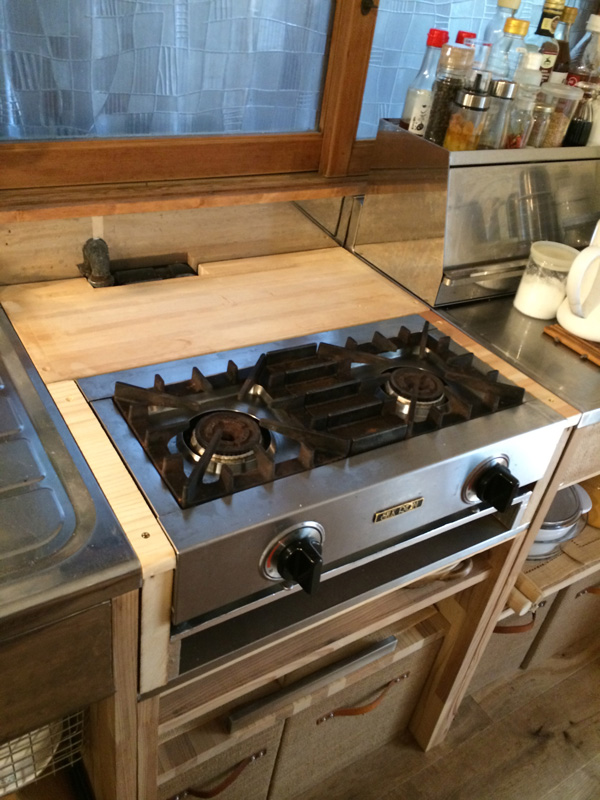 テーブルコンロの周りをつくってビルトイン風に。このあとステンレス板を貼りました。