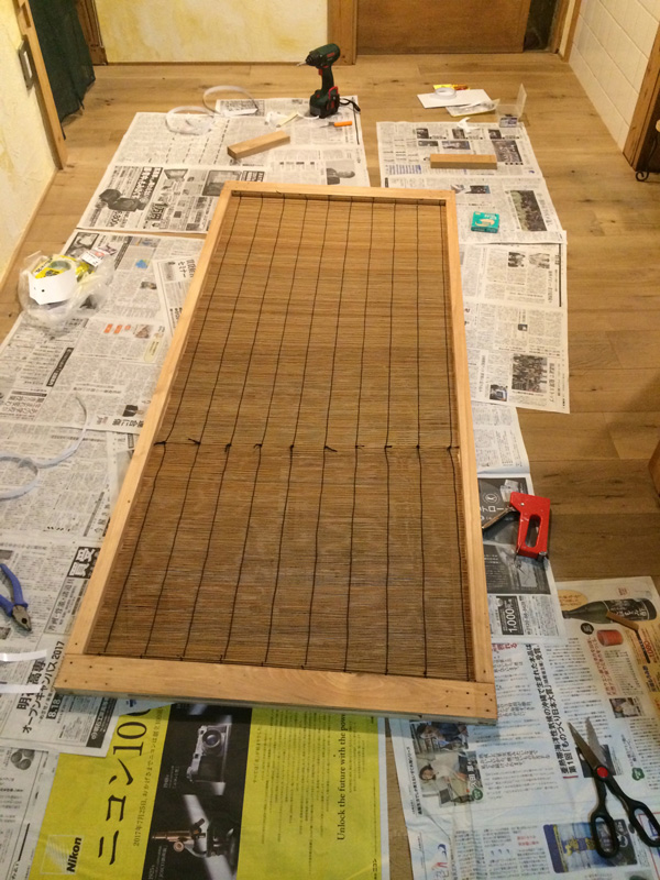 ![夏になって玄関に網戸が欲しいのでつくります。簾を再利用。]()