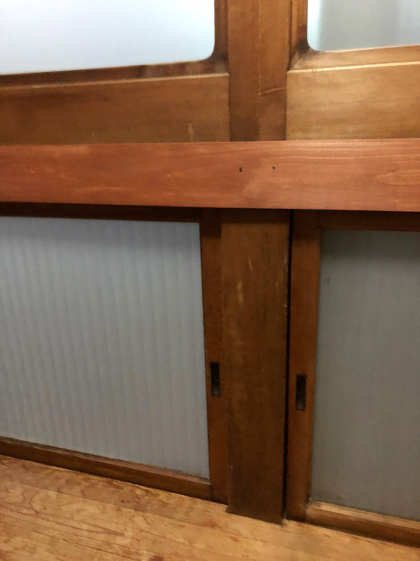 ![しかも余り木材でつくるので、穴や継ぎ接ぎだらけ。周りの建具と馴染むようにポアステインとオイルで古色に仕上。]()