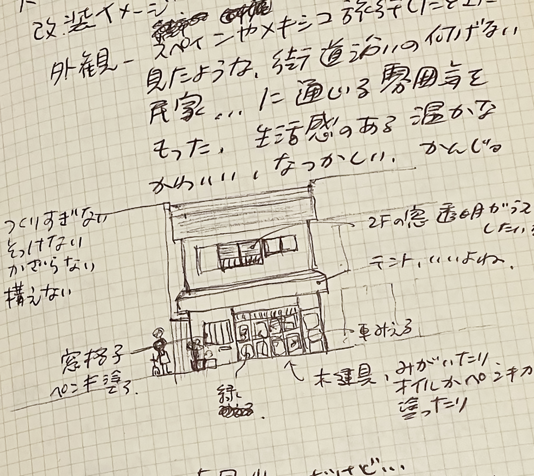 ![玄関は縁側風。当初の予定と変更のため、急きょスケッチを描いてお伝えすると、]()